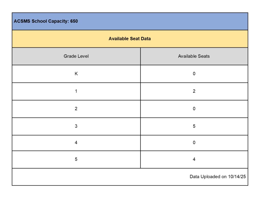 Below is our student capacity/seat availability, by grade level. We are required to update this information every 12 weeks, please note that the capacity number may change during the 12-week period as family members may withdraw or new families apply.